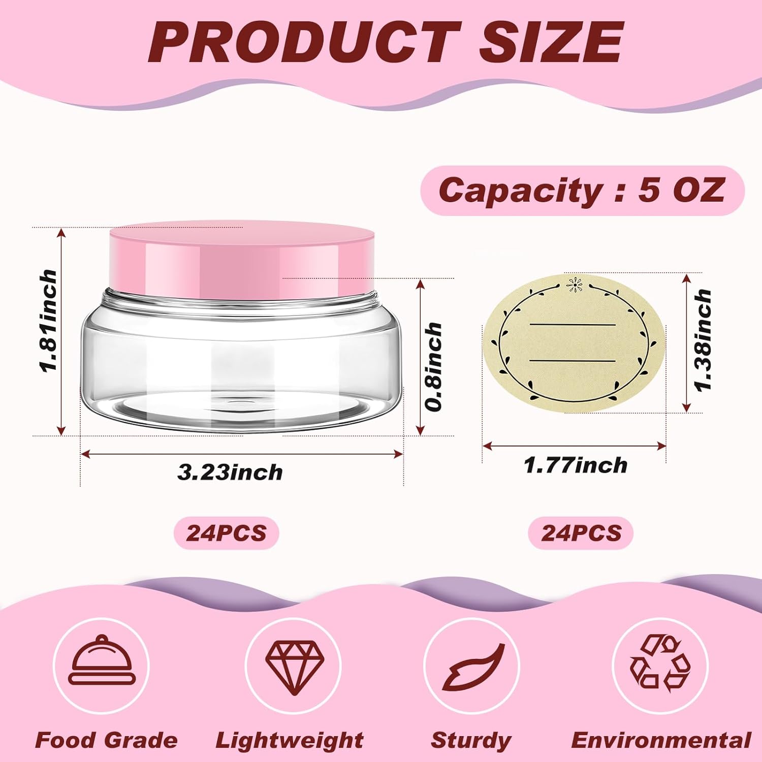 Tessco 24 Pack Plastic Jars with Lids Labels Empty Clear Plastic Jars Round Refillable Cosmetic Containers Body Butter Containers Bulk Sugar Scrub Bottle for Make Up(5 oz,Clear, Pink)