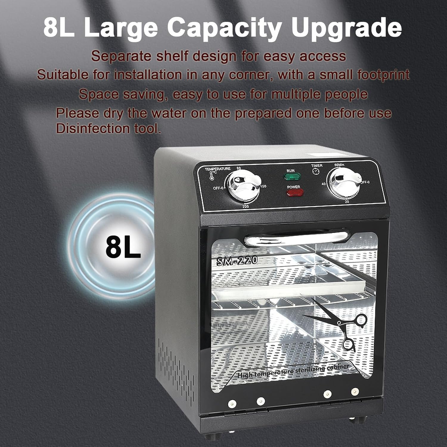 - 【Time and Temperature Setting】Replace ozone sterilizer with high temperature. It kills most dirt attached to tool surfaces, ensuring a safe, hygienic environment. And can run the operating time (0-60 minutes) and temperature (80°C-220°C) according to your needs. It is very convenient to use. Just turn two buttons to get started.
