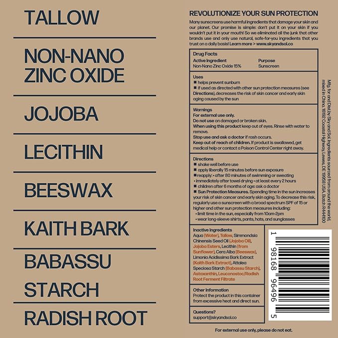 - Nourishing Skincare with 100% Grass-Fed Tallow: Tallow is rich in skin-compatible nutrients that help moisturize and protect. Sky and Sol combines effective sun protection with deeply nourishing care, making this a versatile, everyday sunscreen cream for face and body.