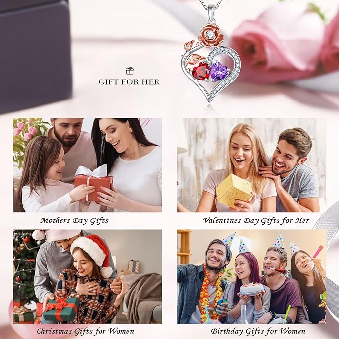 Iefil Rose Heart Birthstone Necklaces for Women - 925 Sterling Silver Double Birthstone Necklace, Anniversary Birthday Gifts for Women, Jewelry Gifts for Wife Her