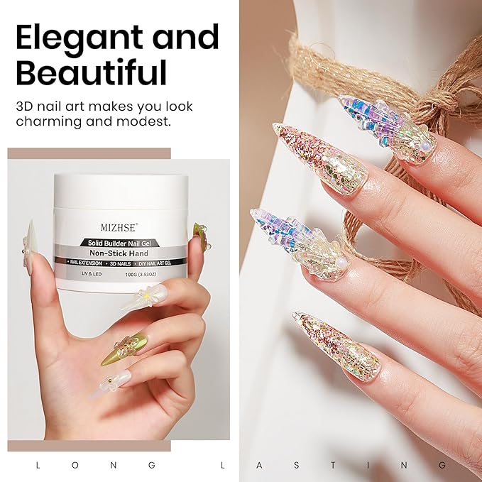 - 100 g Solid Builder Gel Kit: MIZHSE upgraded non-sticky formula 3.5 oz solid builder gel kit, the better choice for professional and home salons. This kit includes 1*100 g clear solid builder nail gel, 1*double-head nail art pen for 3D nails, 6 colors nail art glitter, 1*double-head nail art and 36pcs nail forms