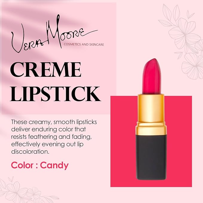 Vera Moore Creme Lipstick, Long Lasting, Lightweight, Moisturizing Opaque Color with Staying Power, Fragrance, and Paraben Free Cosmetics Soft Lipstick (Candy)