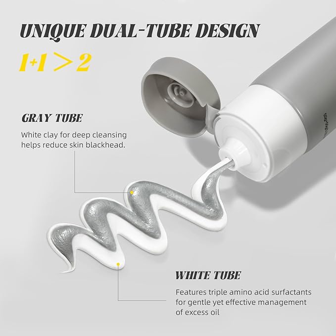 - 【Dual-Tube Facial Cleanser】White tube is amino acid facial cleanser, gentle cleansing for daily use; Gray tube is clean mud film, cleans pores and dirt, reduces blackheads. The Cleaning power is 1+1>2