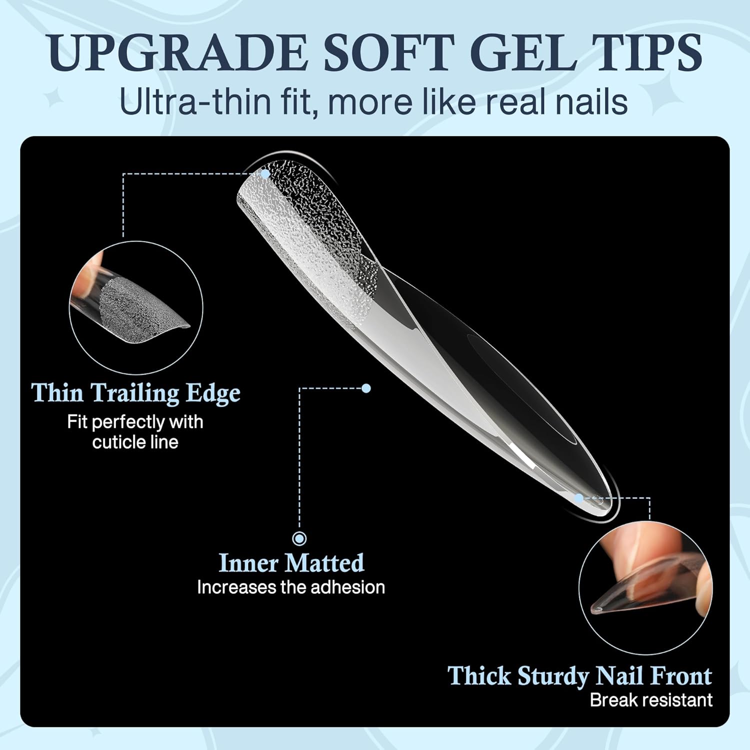 - 【New Material Gel Nail Tips】The full cover nail tips are using newest soak off soft gel material, thinner and more flexible than others, providing a more natural and comfortable apply. The gel tips no c curve and won't easy to fall off, nontoxic and tasteless, gentle on your natural nails.