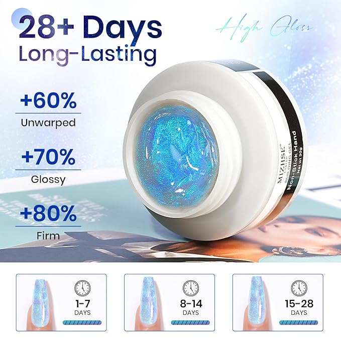 - Aurora Blue & Clear Solid Builder Gel: MIZHSE new upgraded solid builder gel for nails contains 2*30 g/1.05 oz hard gel for nails, 1*3D mold, 1*double-head pen for 3D nails, and 36 pcs nail forms. This nail builder gel is solid material, and won't leak everywhere, just use your finger to extend your nails. Easy application, friendly for nail beginners and nail lovers