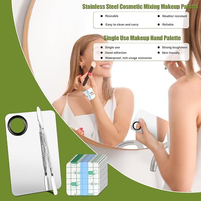 - 4.【Multi-Functional】Makeup palette set for foundation is commonly used for mixing cosmetics/foundation/lipstick/eyeshadow/nail polish/mascara/art paints/cream, etc. It can also be used as a disposable hand palette makeup, which not only keeps your hands clean, reduces residue or mess, but even covers up small wounds, and keeps the skin dry when taking a shower.