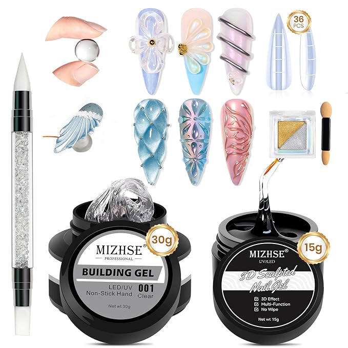 - Solid Builder Gel for Nails: MIZHSE new upgraded solid builder gel contains 1*30 g/1 oz hard gel for nails, 1*15 g 3D painting gel, 1*chrome nail powder, 1*double-head pen for 3D nails, and 36 pcs nail forms. This nail builder gel is solid material, and won't leak everywhere, just use your finger to extend your nails. Friendly for nail beginners and nail lovers
