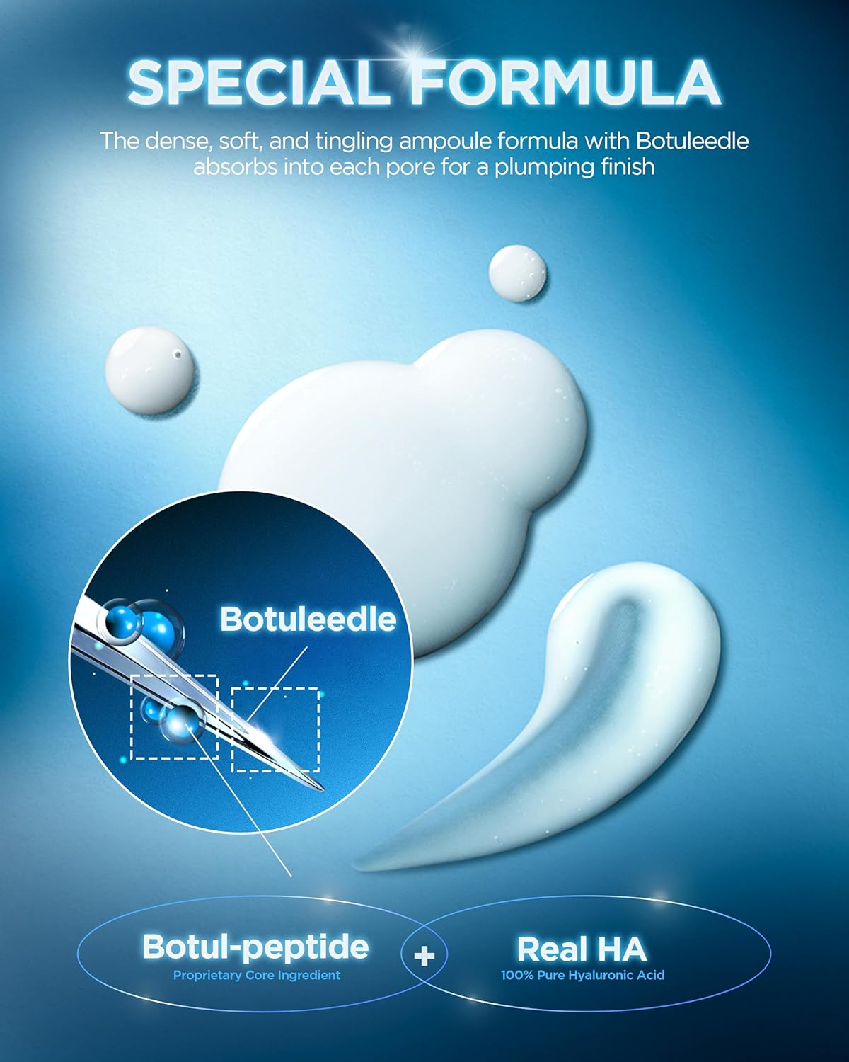 - BOTUL-PEPTIDE POWER β Features 50,000ppm ultra-low molecular hyaluronic acid, PDRN, Panthenol, and Squalane. This high-purity formula plumps skin, tightens pores, and delivers deep hydration for smoother texture.