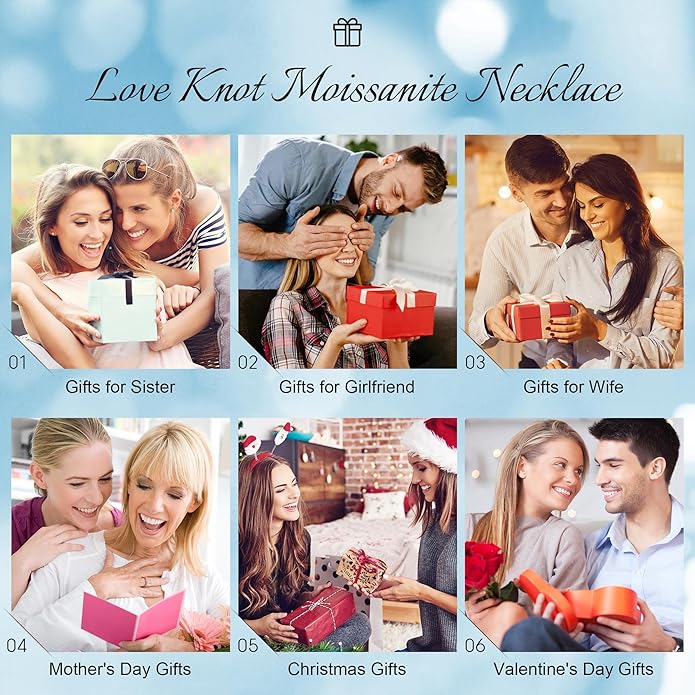 - GIFTING: Moissanite love knot necklace is beautifully wrapped, with velvet jewelry box, presentation box, gifts box, silver polishing cloth. Suitable on Birthday, Anniversary, Christmas, Mother's Day, Valentine's Day and so on as a perfect gift to your wife, mom, sister, friends