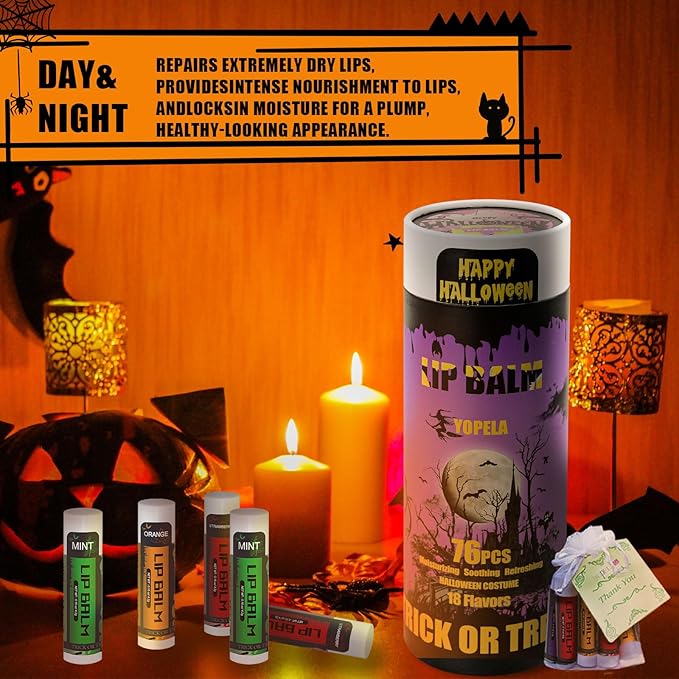 Yopela 76 Packs Halloween Lip Balm,18 Flavors Natural Chap Stick in Bulk, Moisturizing Stocking Dry Lips, Men Women Kids Party Gifts, Lip Care Product with Gift Card