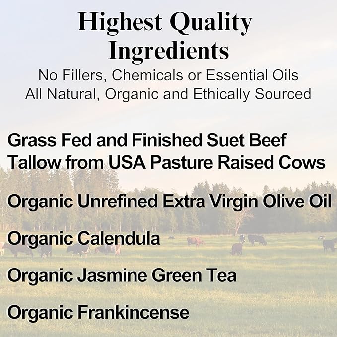 - Herb-Infused, Vitamin-Rich Moisturizer: Infused with organic calendula, jasmine green tea, and frankincense resin—herbs known to calm and support skin renewal. Our grass-fed tallow is rich in vitamins A, D, E & K for a smoother, more radiant appearance, naturally.