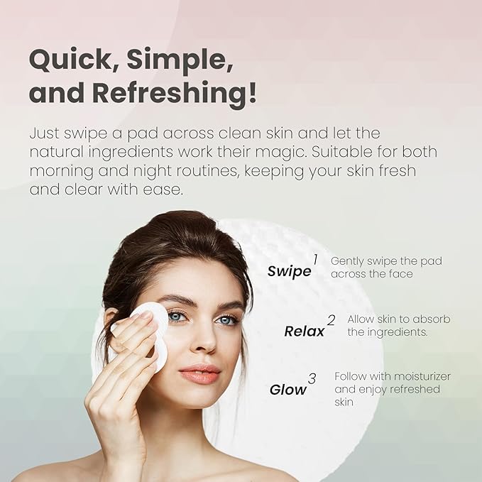 - POWERFUL NATURAL INGREDIENTS: Our toner pads are infused with Glycolic Acid, Salicylic Acid, Tea Tree Oil, Centella Asiatica, and Witch Hazel Extract, these pads gently exfoliate, soothe irritation, and strengthen the skin barrier for a healthier, radiant complexion.