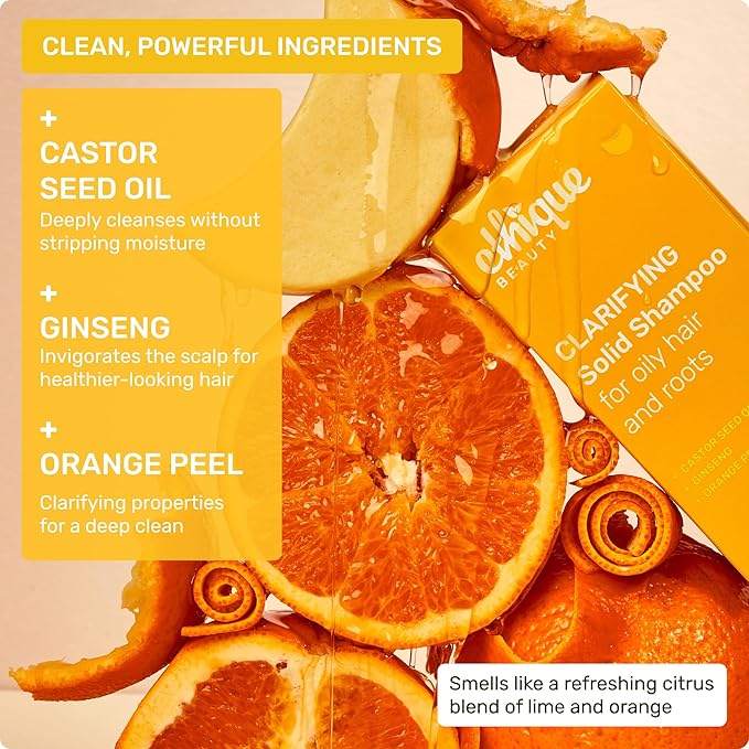 - PURIFY & REFRESH: Banish excess oil and buildup with our Clarifying Shampoo Bar. Infused with castor seed oil for gentle cleansing, ginseng to invigorate the scalp, and orange peel for a deep, refreshing clean. Enjoy healthier, revitalized hair with every wash.