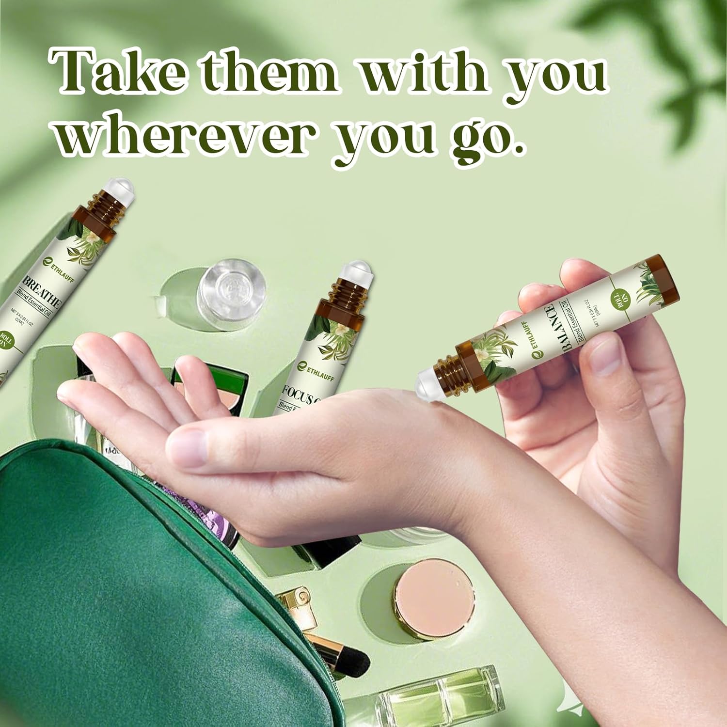 - Skin-friendly Essential Oil Blend Set: Achieve inner peace with our "Balance" formula, which combines soothing natural oils to help reduce stress and anxiety.The "Focus On" essential oil mix is designed to sharpen your mental clarity and boost concentration.The "Breathe" roll-on blend is expertly crafted to promote clear and easy breathing, making it perfect for those who seek relief from respiratory discomfort in a natural way.