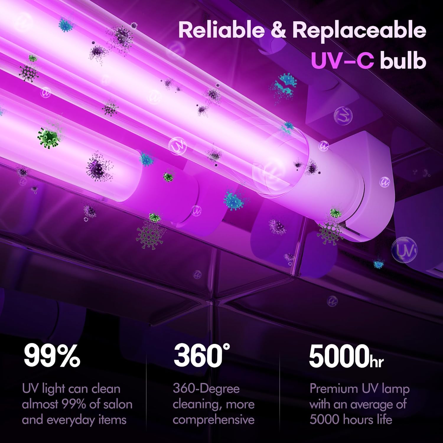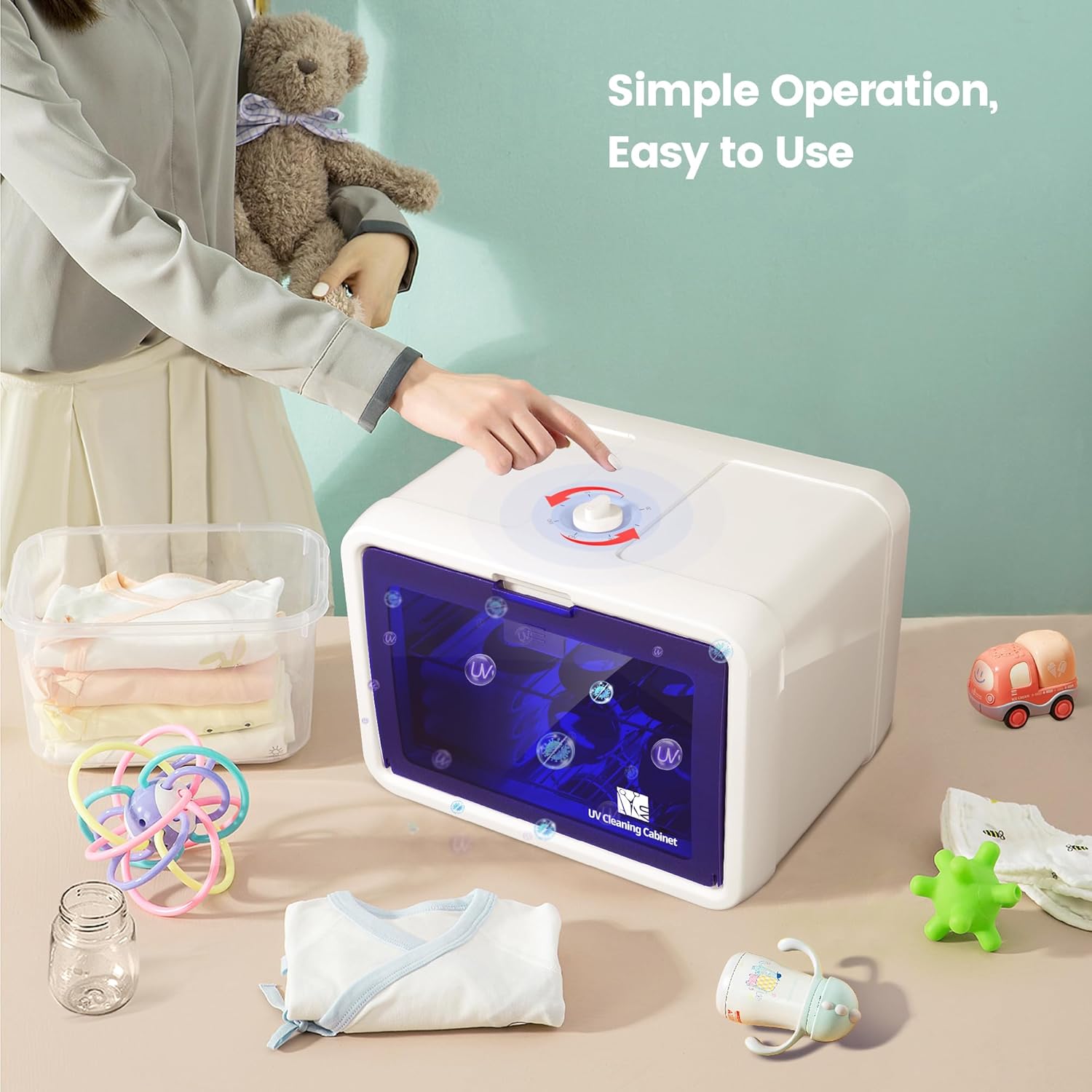 - 【Safety Protection】Reject high-temperature cleaning because it will damage some tight items. This device uses ultraviolet light for cleaning, and the dark glass door isolates the ultraviolet light in the cabinet. The UV cleaning machine has an intelligent sensor switch that can automatically turn off the LED light when the door cover is opened. This smart design prevents your hands from opening the cabinet door and being exposed to ultraviolet light.