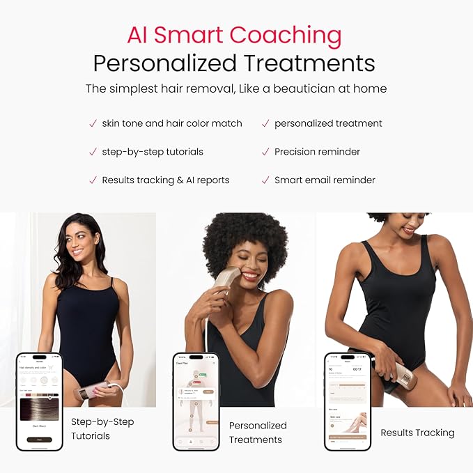 - AI Coaching APP: The i15 pro auto-recommends energy levels and flash modes based on your skin tone, hair density, and treatment area. The personalized treatment plans and instant AI analysis reports for the best results. The step-by-step tutorials and smart email precision reminder ensure hair removal is a breeze