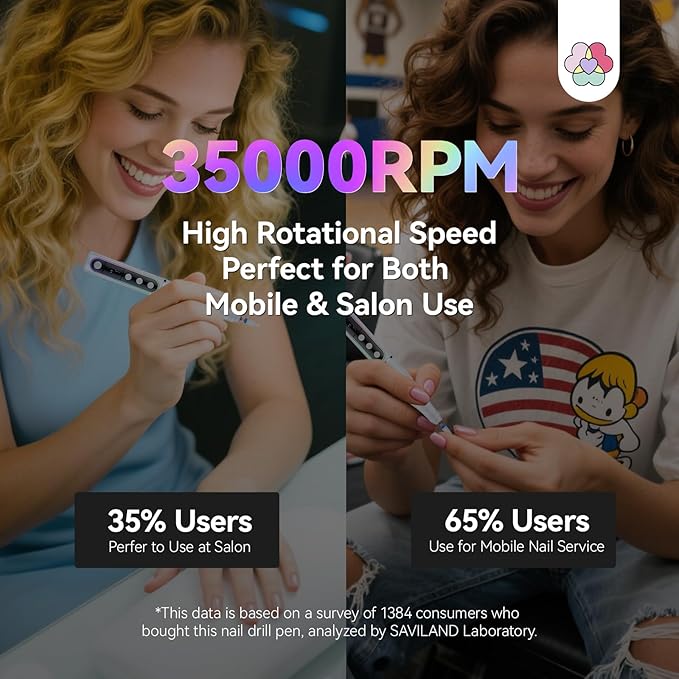- 35000RPM for Fast 10-Second Removal: With a powerful maximum speed of 35000 RPM, the Nail Drill Pen ensures smooth polishing without any interruptions. It's perfect for professional nail technicians looking to quickly and precisely file or remove nail art, reducing total service time by up to 40%