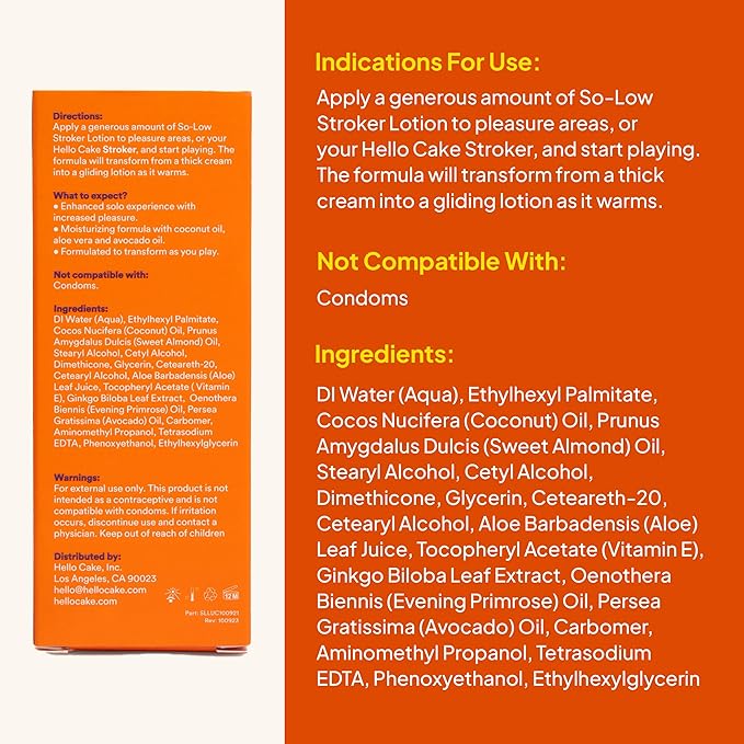 - ENJOY YOUR ME TIME: Keep a bottle of Cake’s So-Low Lotion in your nightstand for easy access. Pair with your favorite Cake Stroker for added fun. Not recommended for use as an internal lubricant.