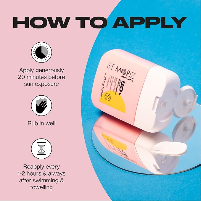 - HOW TO USE: Apply liberally 15 minutes before sun exposure. Reapply: After 80 minutes of swimming or sweating. Immediately after towel drying. At least every 2 hours.Being safe in the sun shouldn't be boring! Our daily use, broad spectrum protection formulas combine sunscreen & skincare to future-proof your skin! Use St. Moriz Suncare alongside St. Moriz Self Tan for a sun safe glow.