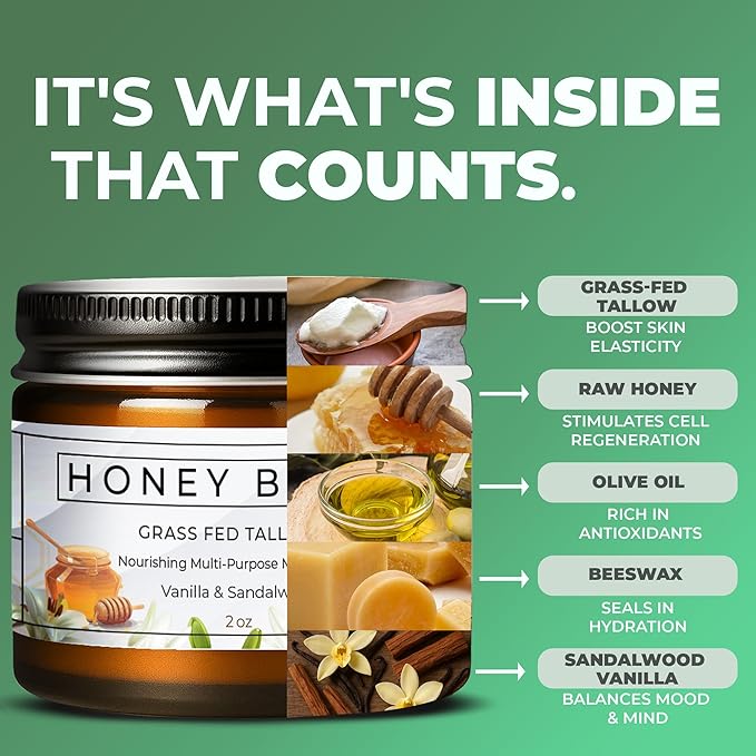 - ONLY 6 INGREDIENTS – We blend grass fed, grass finished beef tallow, wild raw honey, beeswax, organic olive oil, with sandalwood and vanilla essential oils. No fillers, no fluff. Just deeply nourishing goodness your skin will love.