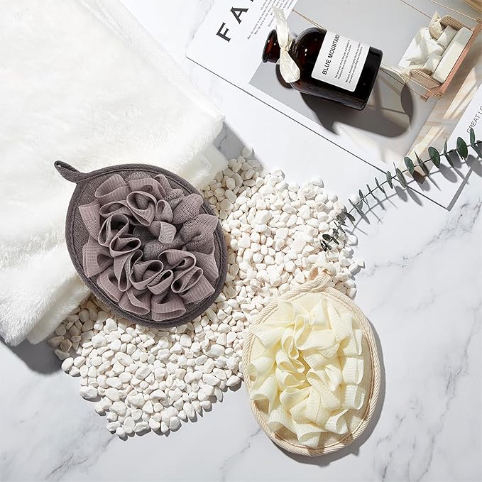 Boao 6 Pcs Bath Shower Pouf Sponge Mesh Pouf Shower Ball Exfoliating Body Sponge Pad Scrubber Glove with Flower Bath Ball (Khaki,Dark Brown,Beige)