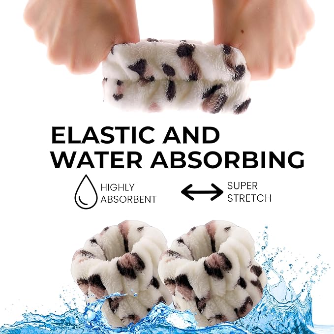 Spa Headband Wrist Band for washing face set Sponge Makeup Skincare Headband Wrist Towels Bubble Soft Terry Towel Cloth Hairband for Women Puffy Headwear Non Slip Thick Thin Hair Headwear (Leopard)