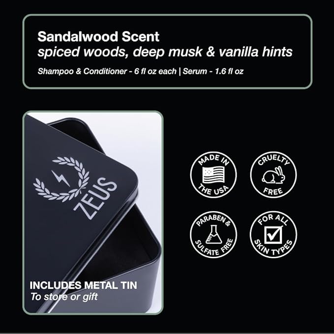 - MADE IN USA: The Essential BeardPLUS Kit, featuring our signature Sandalwood fragrance, includes: (1) 6 oz. BeardPLUS Shampoo, (1) 6 oz. BeardPLUS Conditioner, and (1) 1.6 oz. BeardPLUS Serum Oil, all packaged in our classic ZEUS Gift Tin.