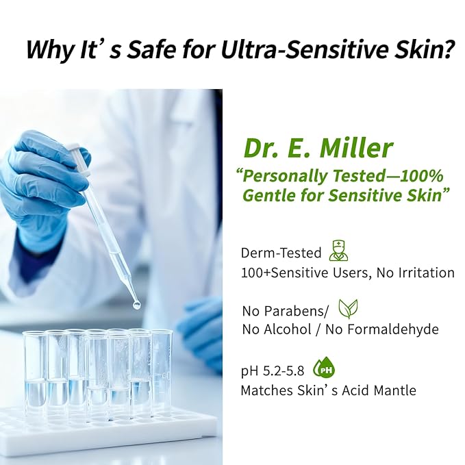- SAFE FOR ULTRA SENSITIVE SKIN & LIGHTWEIGHT– Derm-tested (100+ users, no reported irritation—even with subtle, sensitive-skin fragrance); Paraben/Alcohol/Formaldehyde-Free; pH 5.2-5.8 Mantle-Safe; Absorbs in 30 secs (non-greasy, no residue)