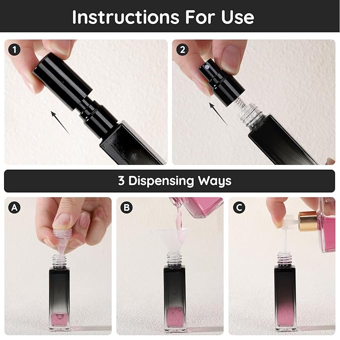 - Easy to Refill & Use: Comes with 1*FUNNEL+1*DROPPER+1*PUMP, make it easy to refill the perfume bottles with your preferred fragrance. Press pump head design, allowing you to keep your mini perfume atomizer ready for use at all times