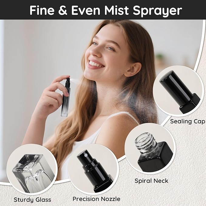 - Fine Mist Atomizer: With the utilization of high precision nozzle, these perfume bottles provide a fine and even mist spray, it is great for dispensing perfume