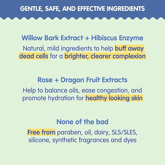 - GENTLE INGREDIENTS: Formulated with Willow Bark Extract and Hibiscus Enzyme to gently exfoliate for a brighter, healthier complexion. A gentle face wash for kids that supports preteen skincare while keeping skin soft and hydrated.