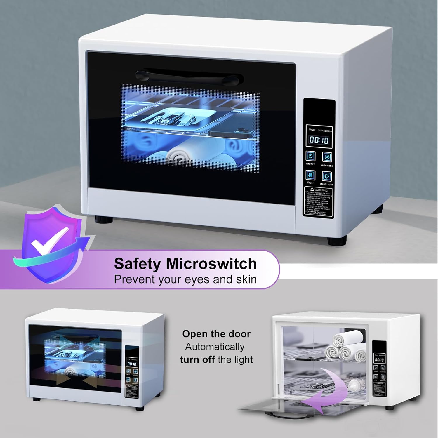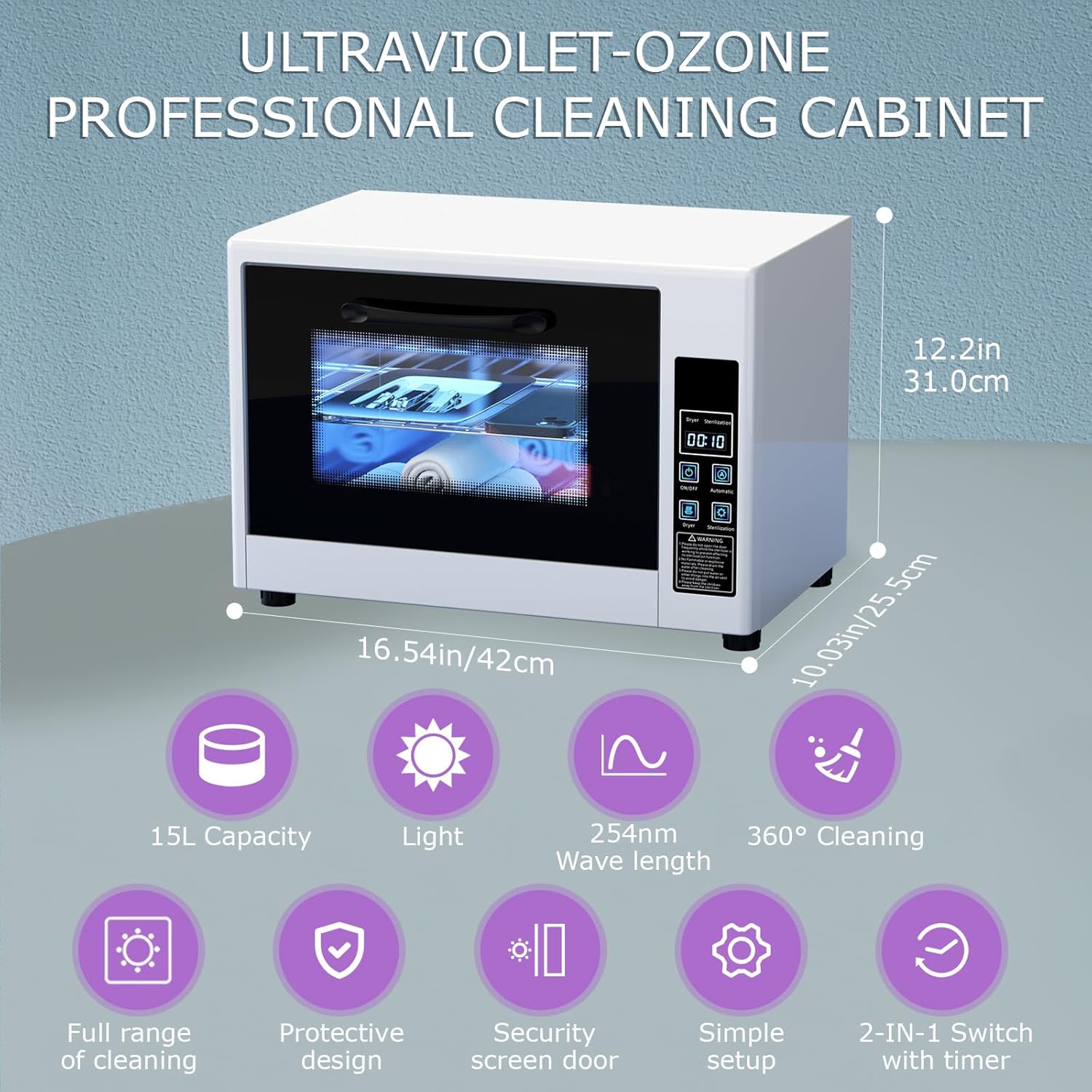 - Powerful & Hot Air Cleaning: This cleaning cabinet uses light and hot air to remove harmful substances and purify the air. light penetrates deep into tools, the stainless steel interior effectively accomplishes 360ยฐ cleaning of items, while hot air dries them quickly. The result? Clean, dry tools ready for use, providing a reliable hygiene solution for every professional