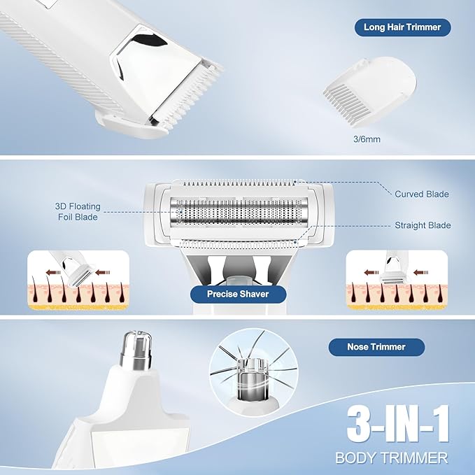 - [3-IN-1 Bikini Trimmer For Whole body Hair Removal]: This electric women shaver comes with three different detachable blade heads, including electric razor, foil shaver and nose trimmer, making it effective in various parts of body, such as bikini areas, arms, underarms, nose, legs, and the body.