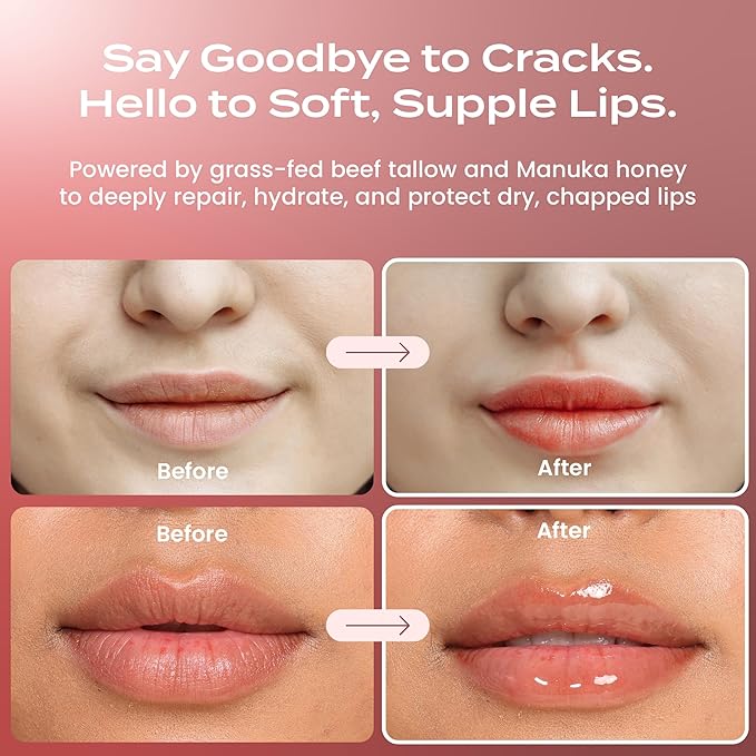 - Beef Tallow Moisturizer & Nourishment: Our beef tallow moisturizer locks in hydration and helps maintain soft, supple lips day and night.