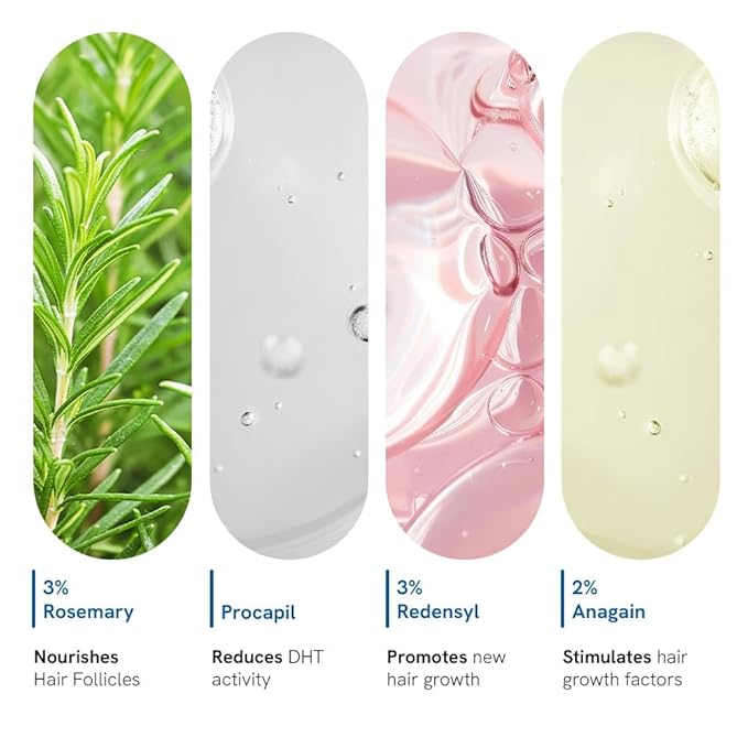 - Triple-Action Hair Growth Serum Roll On – 3 % Rosemary, 3 % Redensyl & 2 % Anagain re-activate dormant follicles, boost oxygen delivery and actively block DHT for stronger roots and thicker strands.