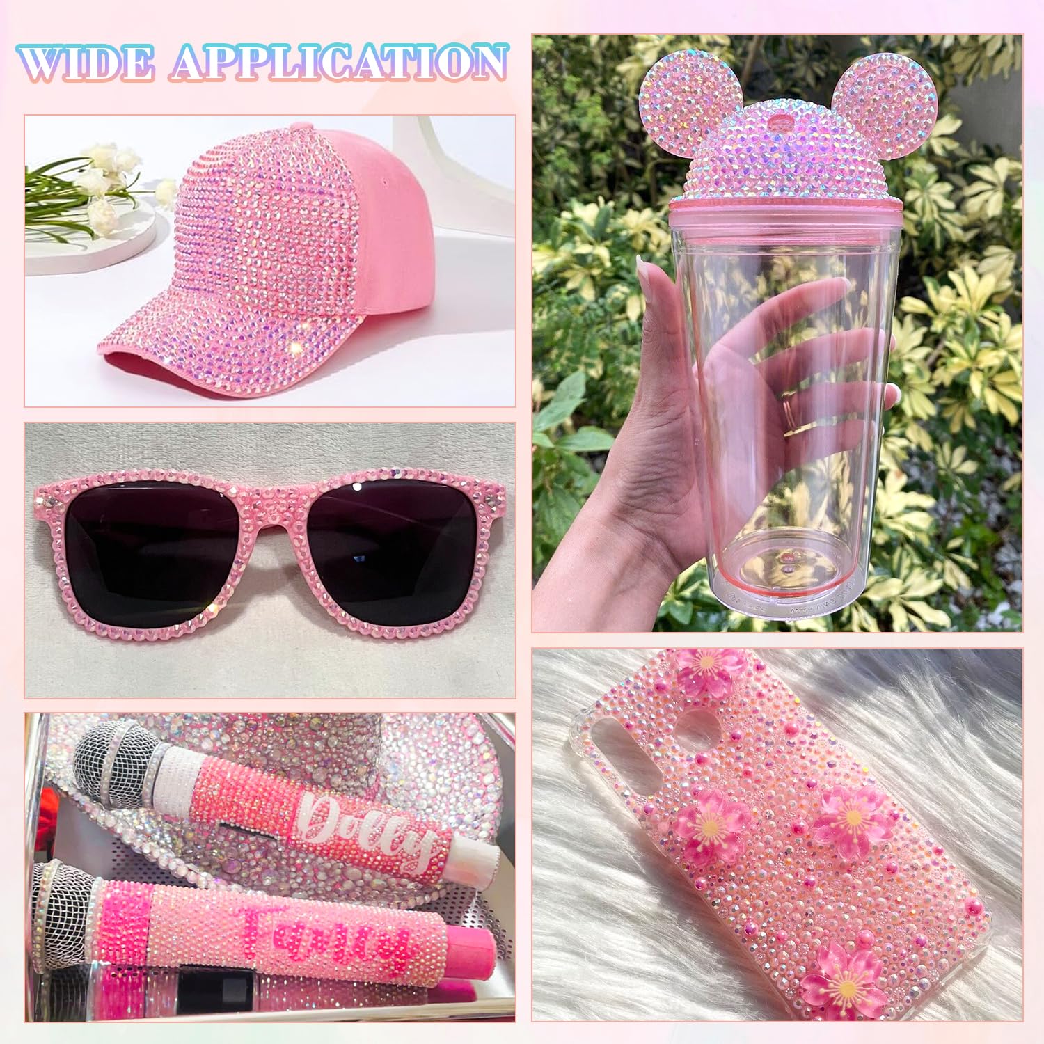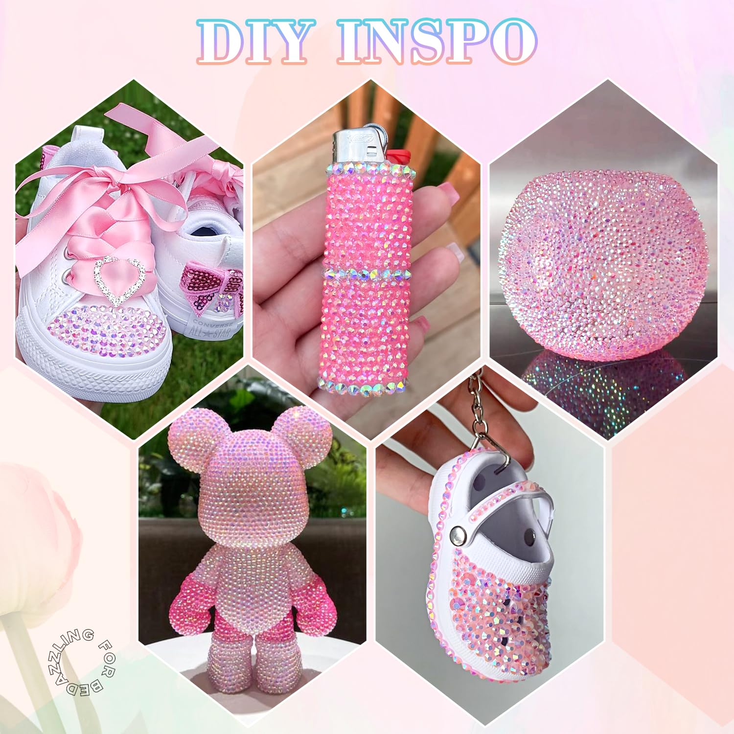 - PACKAGE CONTENT β This all-in-one bedazzler kit includes everything you need to start creating dazzling designs: 1 box of Light Pink AB rhinestones with 24 grids (approx. 30,000 pcs of bedazzling rhinestones assorted size SS6/10/16/20/30 ), 1 precision tweezers, 1 pickup pen for handling small gems, and 3 tubes of B7000 jewelry glue for secure application.