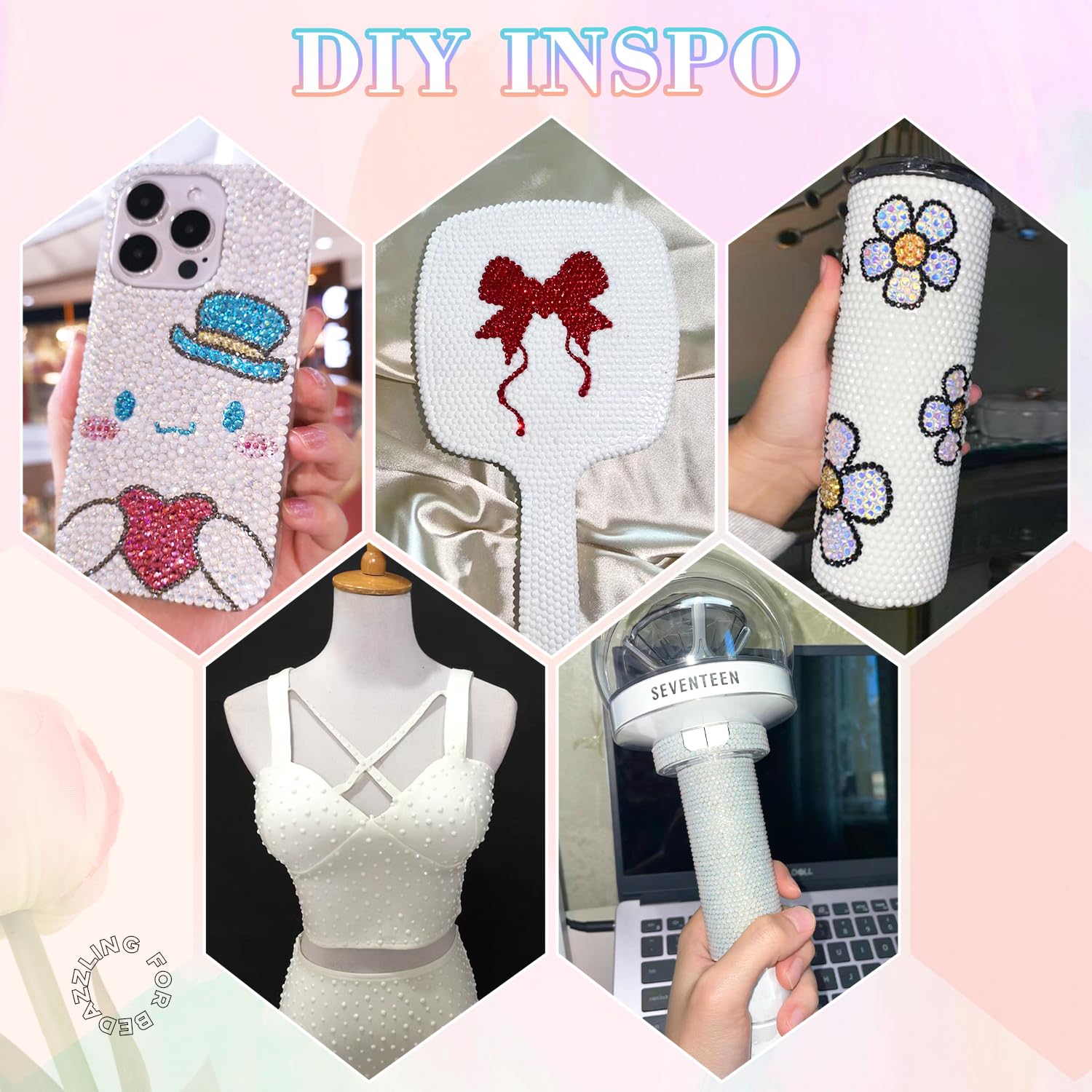 - PACKAGE CONTENT β This all-in-one bedazzler kit includes everything you need to start creating dazzling designs: 1 box of White rhinestones with 24 grids (approx. 30,000 pcs of bedazzling rhinestones assorted size SS6/10/16/20/30 ), 1 precision tweezers, 1 pickup pen for handling small gems, and 3 tubes of B7000 jewelry glue for secure application.