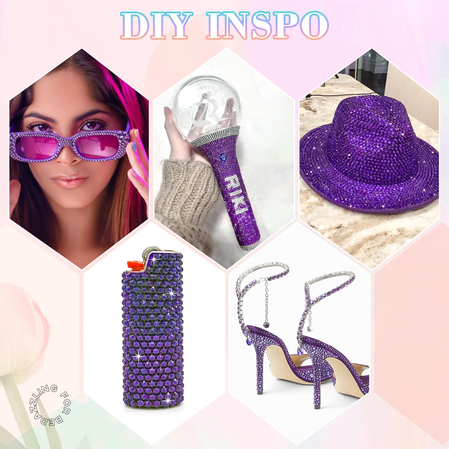 - PACKAGE CONTENT β This all-in-one bedazzler kit includes everything you need to start creating dazzling designs: 1 box of purple rhinestones with 24 grids (approx. 30,000 pcs of bedazzling rhinestones assorted size SS6/10/16/20/30 ), 1 precision tweezers, 1 pickup pen for handling small gems, and 3 tubes of B7000 jewelry glue for secure application.