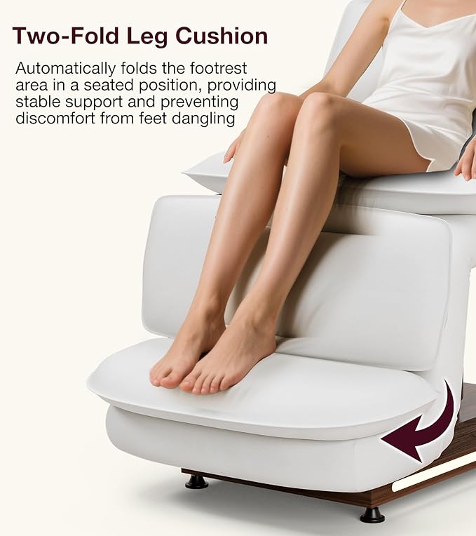 - Two-Fold Leg Cushion: In seated mode, the leg support area folds inward to create firm padding, providing clients with comfortable support to prevent leg strain or numbness. The extra-wide 29.5" bed surface ensures superior stability and ample space for a more relaxing experience compared to standard spa beds
