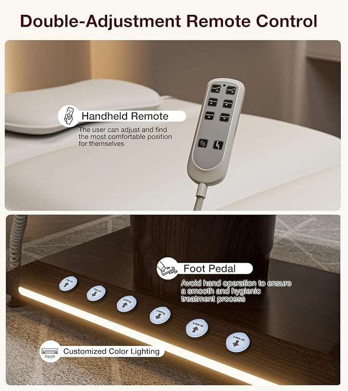 - Dual Remote Control: Comes with both a hand-held remote and a foot pedal, giving you flexible and intuitive control over all electric functions. Whether standing or seated, you can easily adjust the bed without interrupting your workflow, improving both efficiency and the client experience