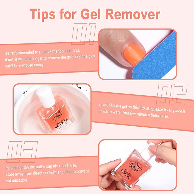 - 【SIMPLE STEPS】 Our gel nail polish remover can be applied in simple steps: 1. File off top coat. 2. Apply nail latex liquid on skin around nails. 3. Apply gel remover, and wait 2-5 minutes then. The gel polish will burst, and then it can be remove easily.