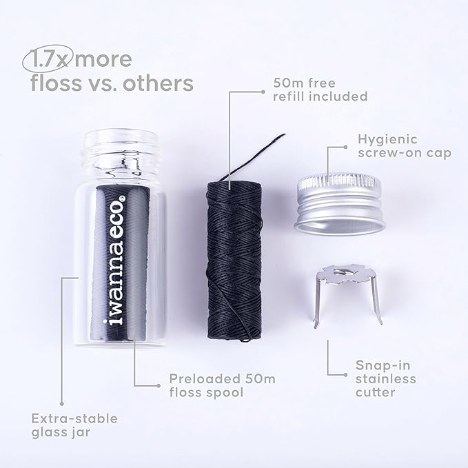 - UNIVERSAL COMPATIBILITY: Our wide, refillable jar fits both our 50-meter (55-yard / 164-foot) spools and standard 30-meter (32-yard / 98-foot) floss refills. A perfect choice for users of eco-friendly, biodegradable dental floss seeking a zero waste oral care solution.