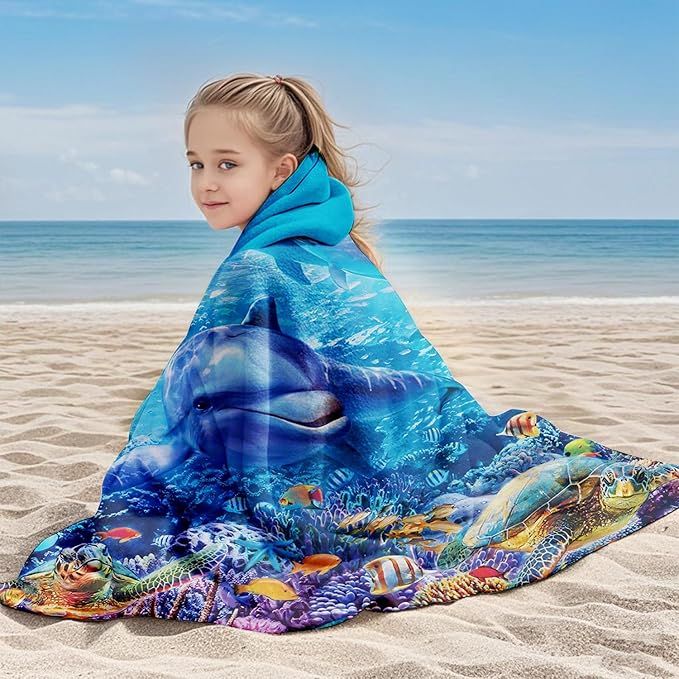 - Playful Dolphin Design: This charming hooded towel features a delightful dolphin, instantly capturing kids’ imaginations! The refreshing ocean colors and lively marine design make bath time, beach trips, or pool days extra exciting—helping your little one dive into fun with aquatic wonder.