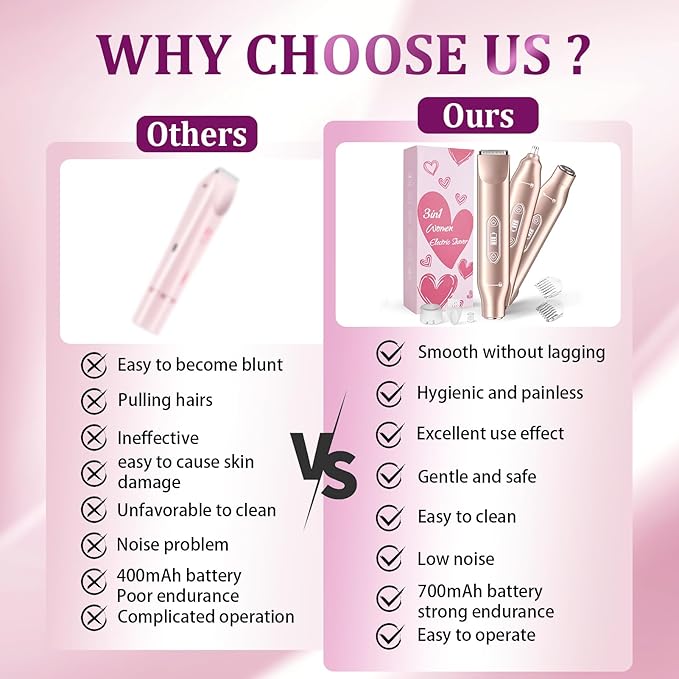 - THOUGHTFUL ACCESSORY SET:Includes 1 Body Hair Trimmer,1 Facial Hair Trimmer Head,1 Nose Hair Trimmer Head,1 Protective Cover,1 USB cable,1 3mm Trimming Comb,1 6mm Trimming Comb,1 x Cleaning Brush,1 x 1 User Manual. If you have any questions about women's electric shaver, please feel free to contact our team of beauty consultants, we will provide you with professional answers within 24 hours. Let you enjoy a hassle-free hair removal experience