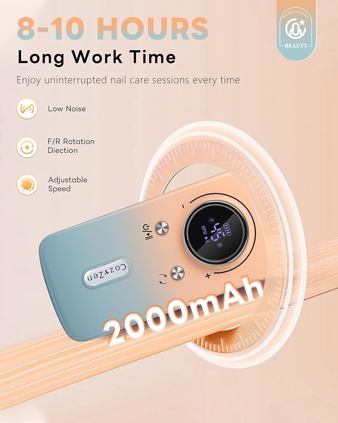 - 【MAX 45000 RPM High Speed】Experience unmatched performance with the CozyZen Cordless Nail Drill, boasting an impressive 45000 RPM high-speed motor. Achieve precise and efficient results on acrylic and gel nails, perfect for both professional salon use and home manicures.