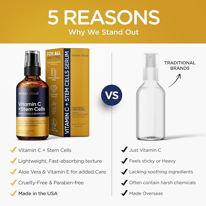 - Natural & Gentle Formula - Crafted with care, our serum features high-quality, natural ingredients like Vitamins C & E, Hyaluronic Acid, Stem Cells and Aloe Vera. Thoughtfully designed to be gentle, it suits even sensitive skin types.