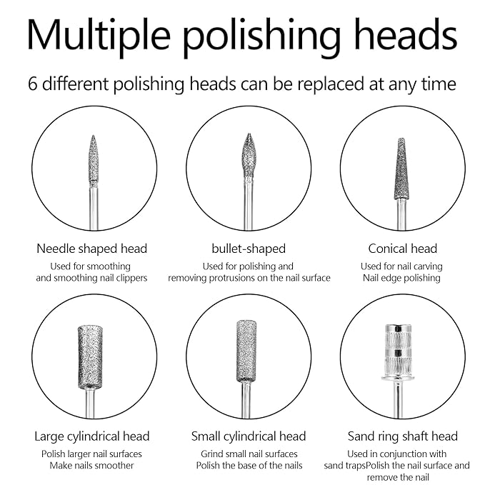 - Multifunctional and USB charging:Nail drills have many applications:sanding,buffering, grinding, sharpening,polishing acrylic and gel nails, removing extension gels, cuticle and dead skin.It can be easily charged via the USB interface (using a power bank, a laptop, or any USB charger (Type-C interface)).Note: Please use a 5V/1A or 5V/2A adapter to avoid damaging the battery.