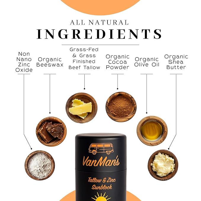 - SIMPLE INGREDIENT LIST – We believe in transparency. These mineral sunscreen sticks are made with just six ingredients: grass-fed beef tallow, cold-pressed olive oil, beeswax, unrefined shea butter, non-nano zinc oxide, and cocoa powder.