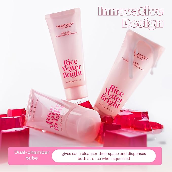 The Face Shop Rice Water Bright Double Foaming Cleanser, 2-in-1 Milky and Jelly Texture, Gentle Face Wash for Hydrating & Moisturizing, Makeup Remover, Korean Skin Care, Vegan, 6.4 fl. oz.