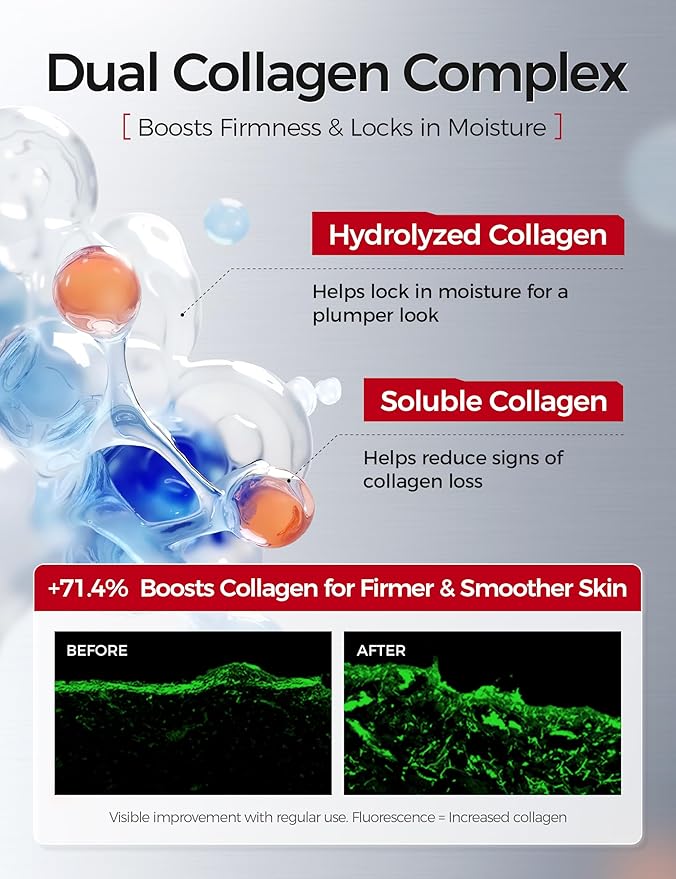 - Improve Moisture Levels and Skin Barrier: Hydrolyzed collagen and niacinamide deliver lasting hydration and support skin elasticity. Caffeine helps reduce puffiness and supports the skin’s natural protective barrier for a refreshed, revitalized appearance